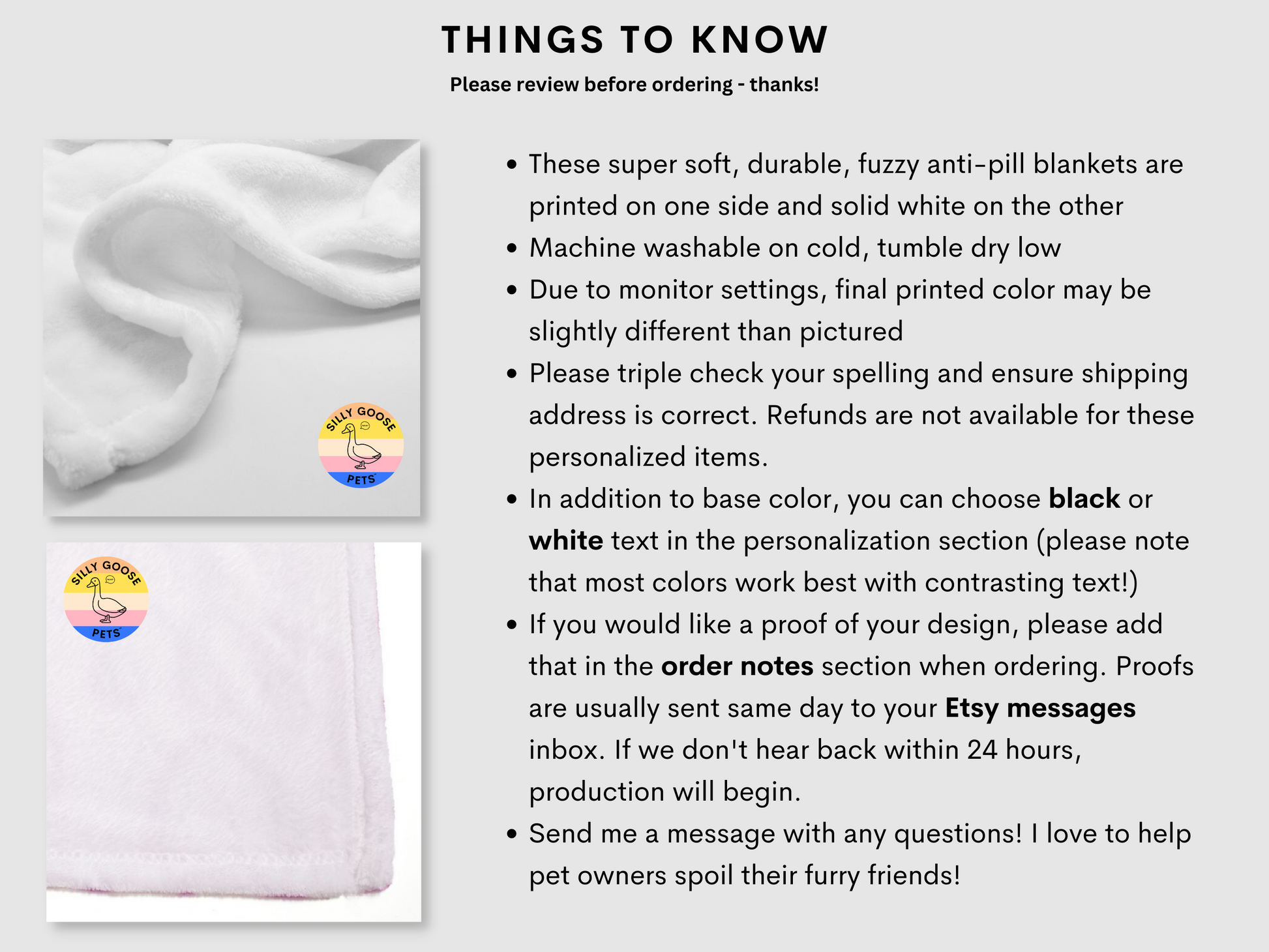 Each blanket is custom printed with your pet’s name and handmade to order.