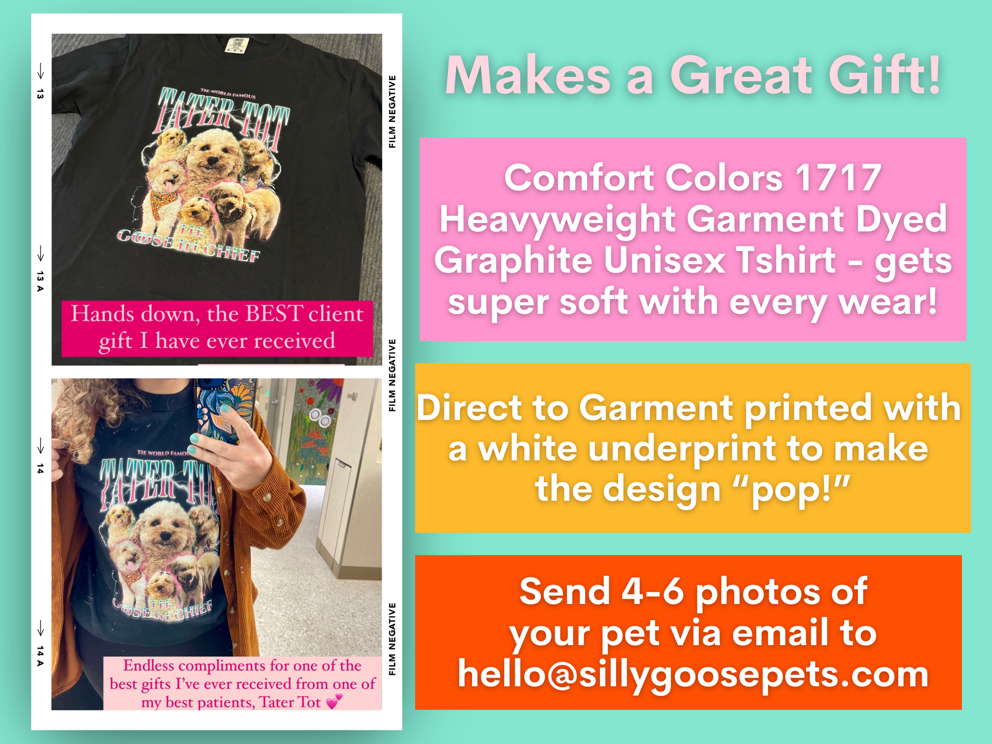 The ultimate gift for any pet lover—or the perfect way to rep your own furry best friend in true retro style. The Custom Pet Portrait Bootleg Style T-Shirt features your pet in a bold, custom-designed “bootleg concert tee” aesthetic, inspired by vintage 90’s music merch. Every shirt is created from your pet photos and transformed into an eye-catching design you won’t find anywhere else.