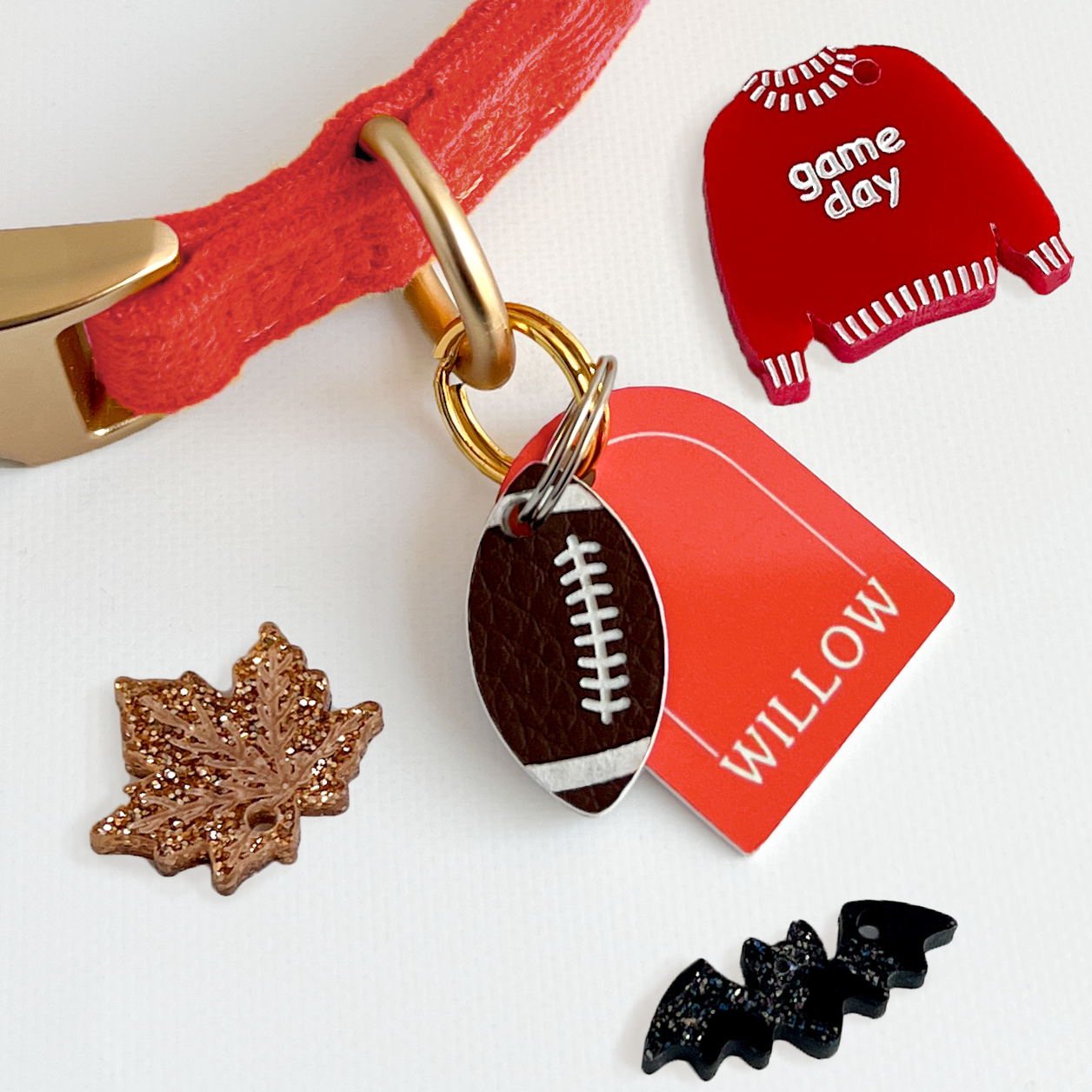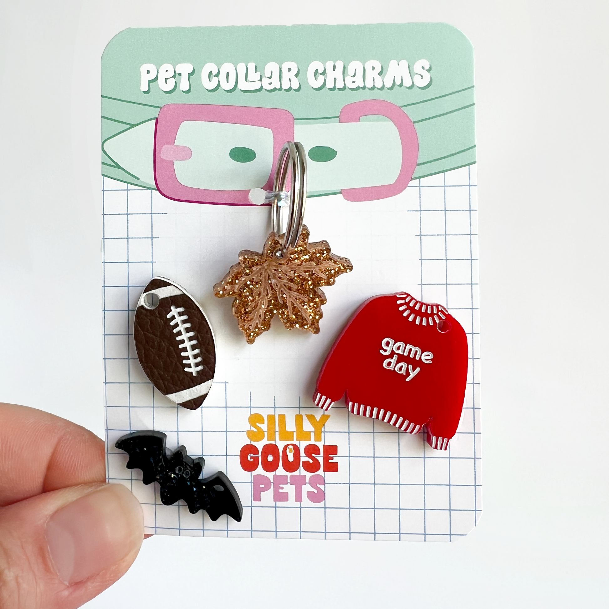 Celebrate cozy season with our handmade Fall Charm Set, featuring four festive designs: a leatherette football, a glittery autumn leaf, a game day sweater, and a sparkling spooky bat. Each charm clips easily to your pet’s collar tag ring, making it simple to swap in seasonal style all autumn long.