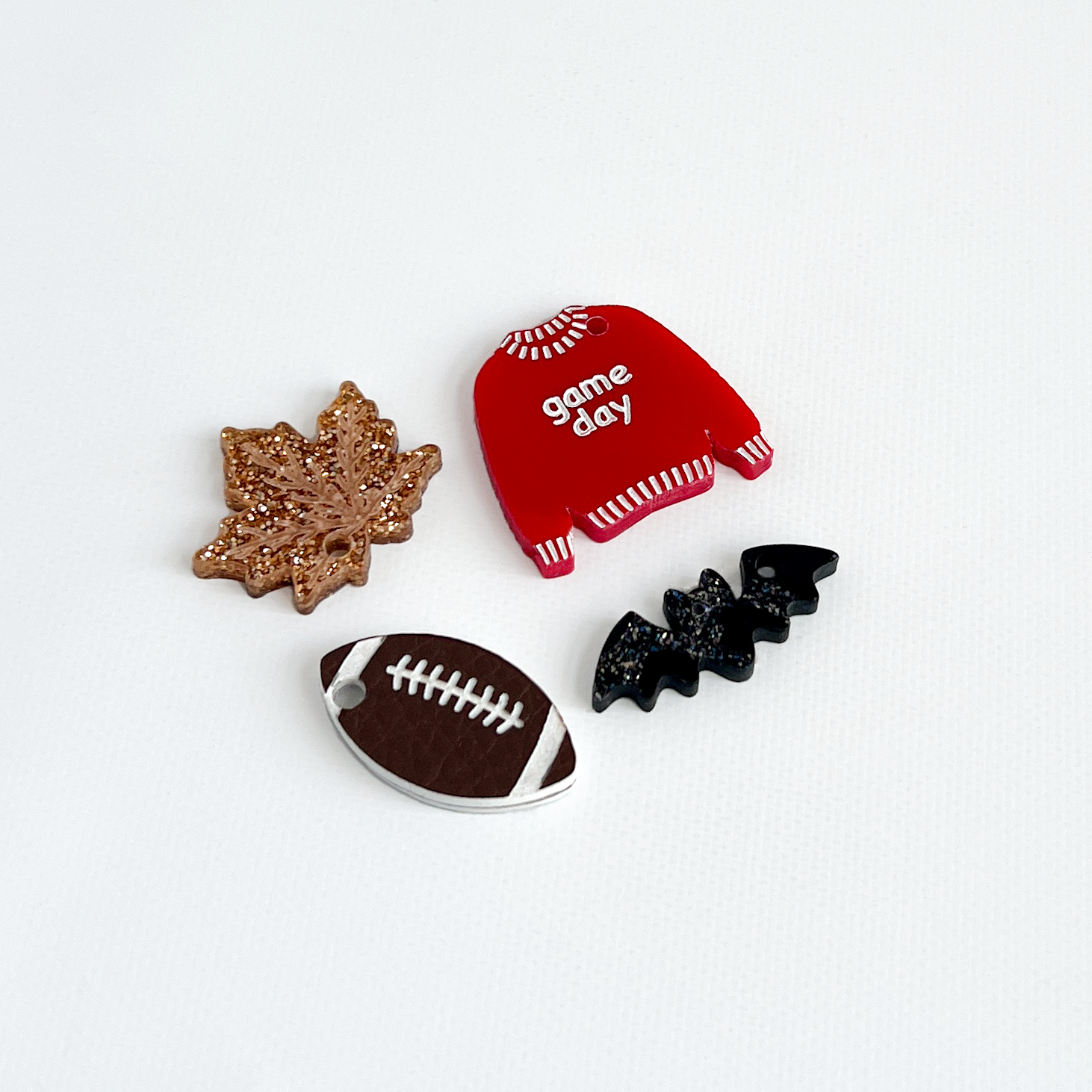 Includes 4 charms: football (leatherette), glitter leaf, game day sweater, glitter bat