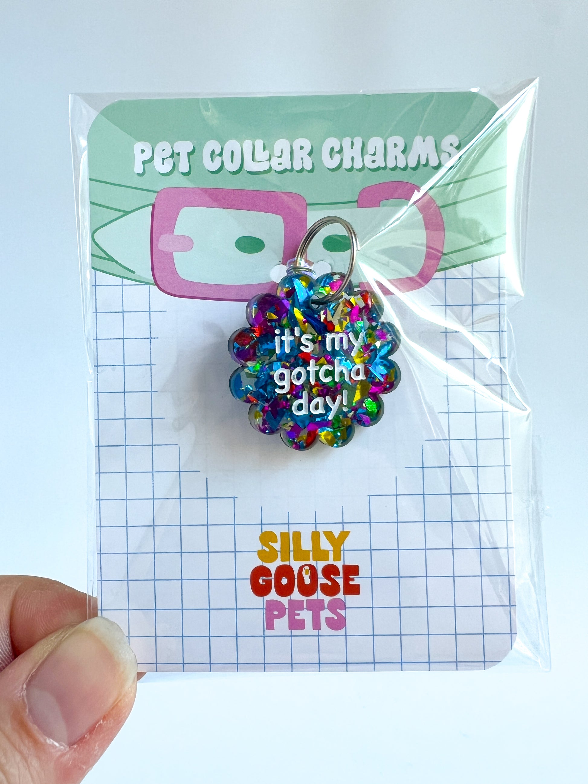 Every adoption anniversary deserves to be celebrated in style! The Gotcha Day Single Charm is a cheerful, confetti-filled accessory that proudly declares “It’s My Gotcha Day!” Handmade in Chicago and individually packaged, this sparkly little charm is the perfect way to mark your pet’s special milestone.
