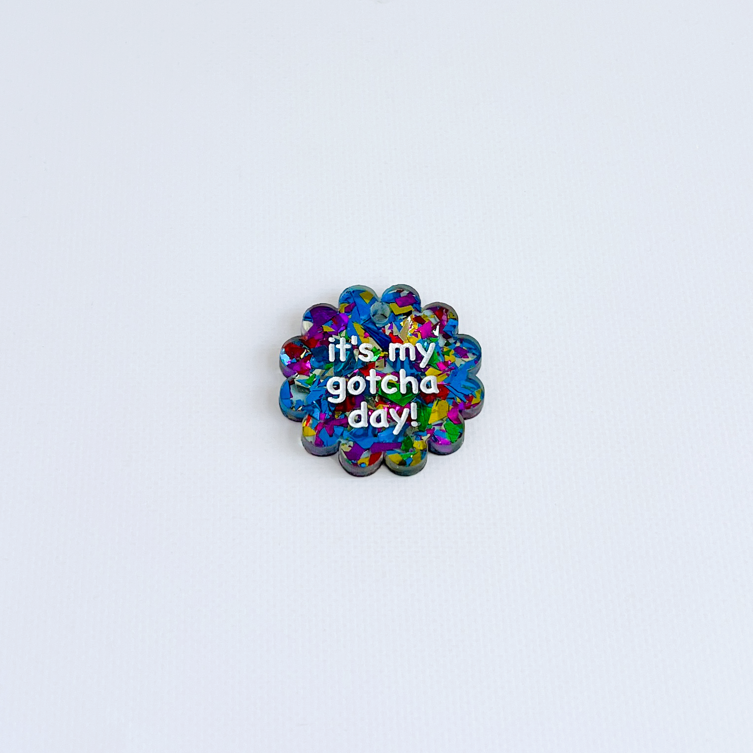 Confetti glitter acrylic design with “It’s My Gotcha Day!” text