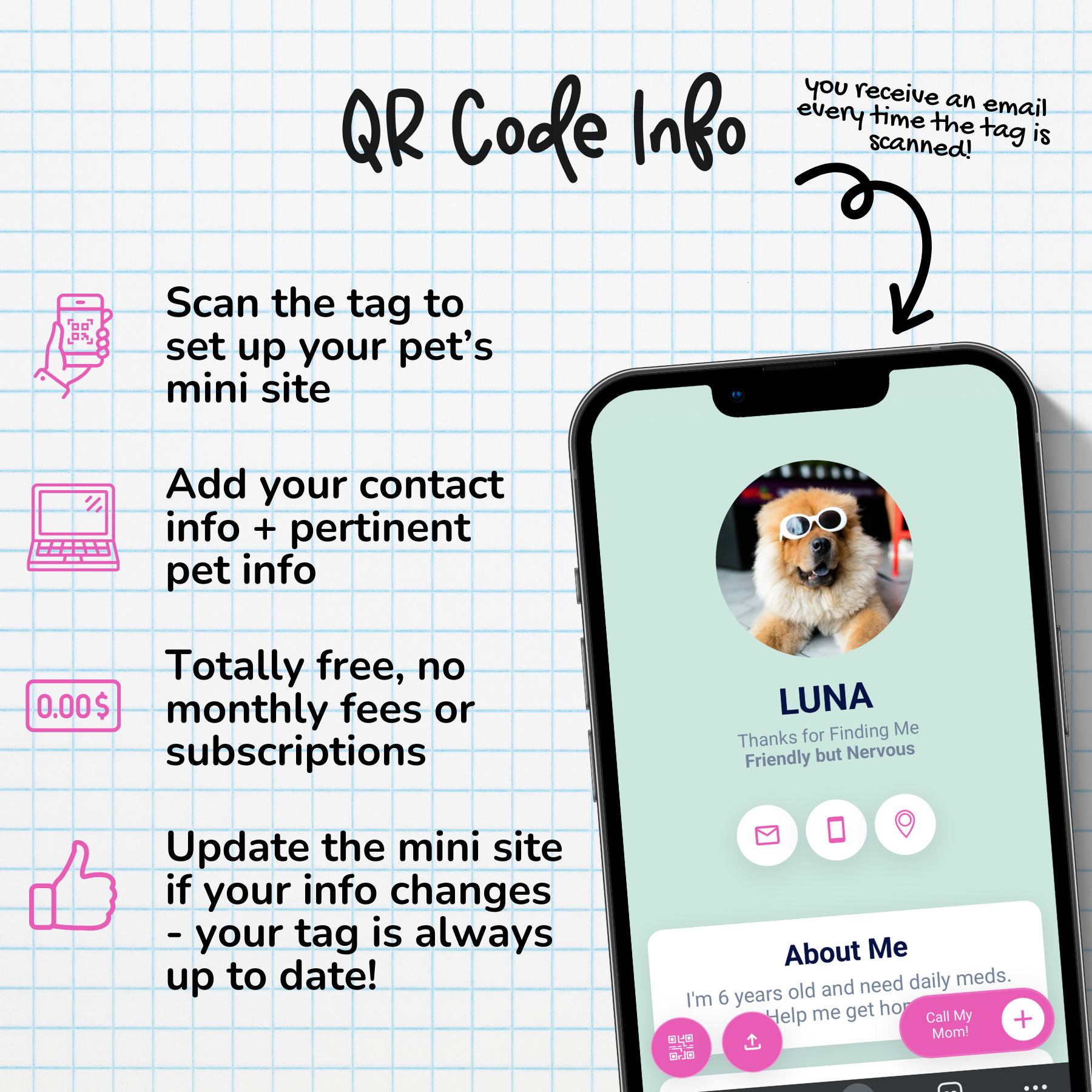 QR code links to a customizable mini site to display pet info and owner details