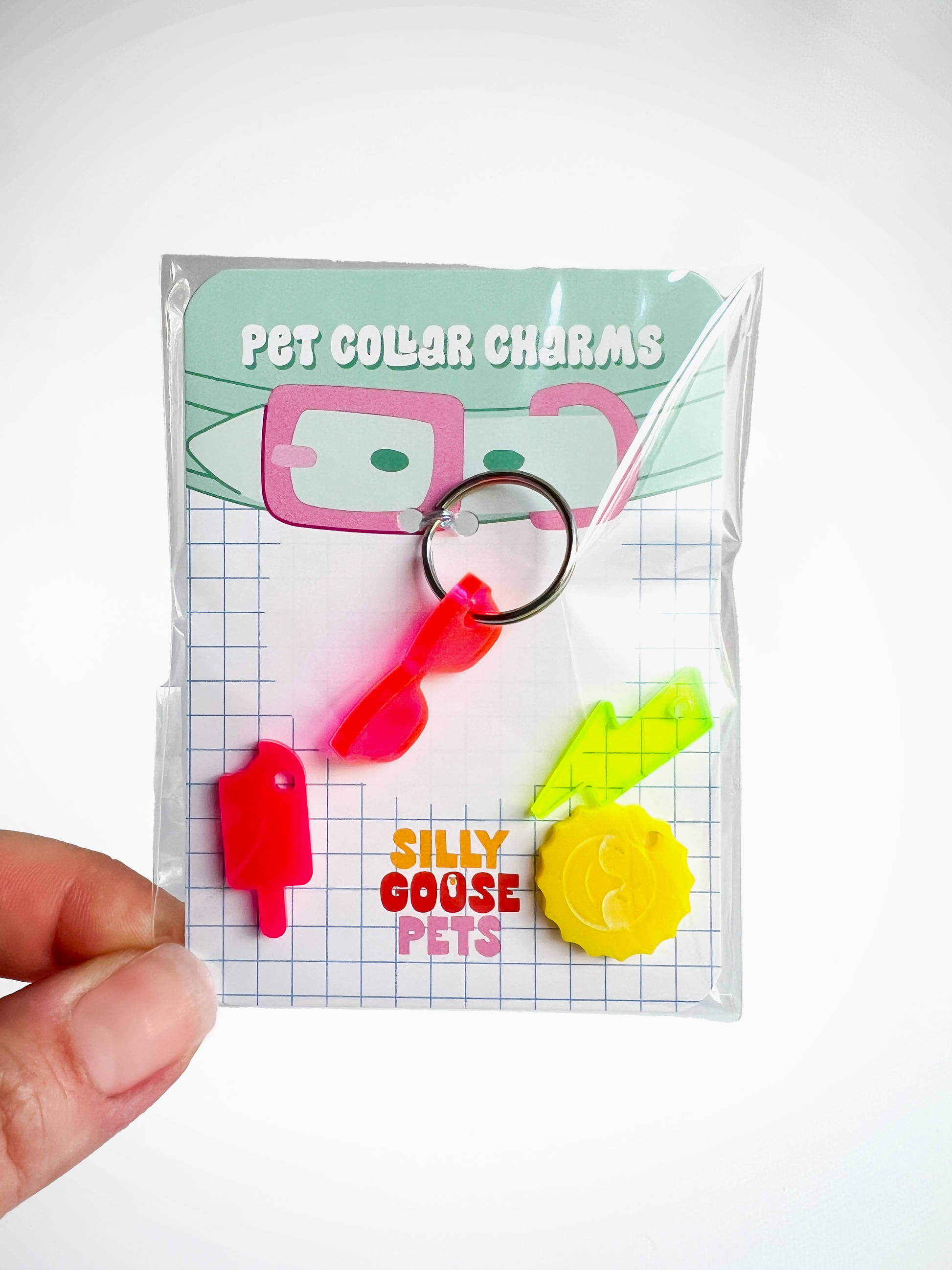 Each charm clips easily onto your pet’s collar tag ring using the included silver split ring, making it simple to swap designs for summer outings, photos, or everyday wear. Lightweight yet durable, these charms are made from 1/8" solid acrylic and finished with care in our Chicago studio.